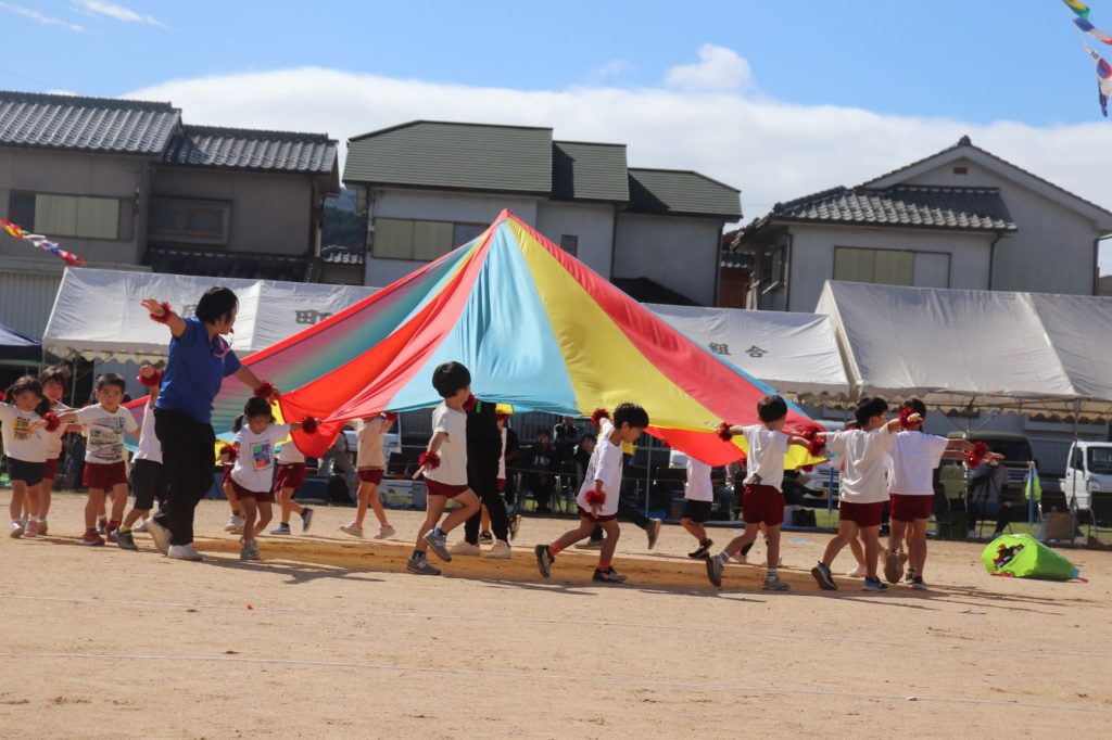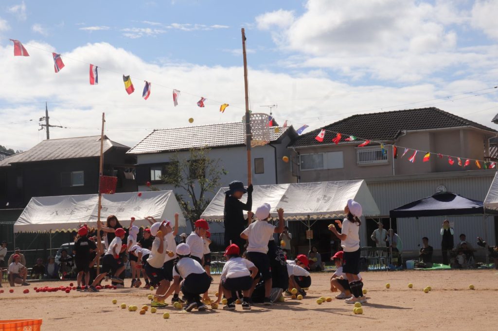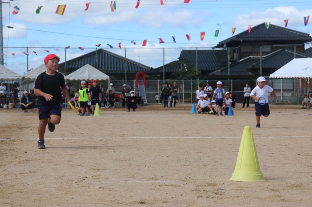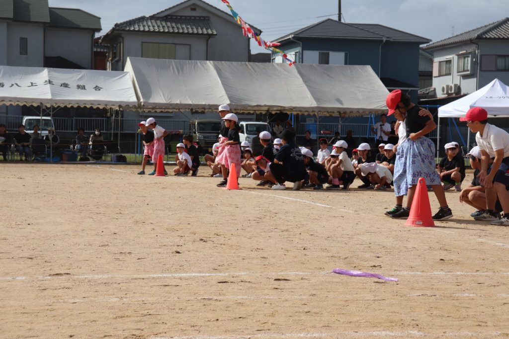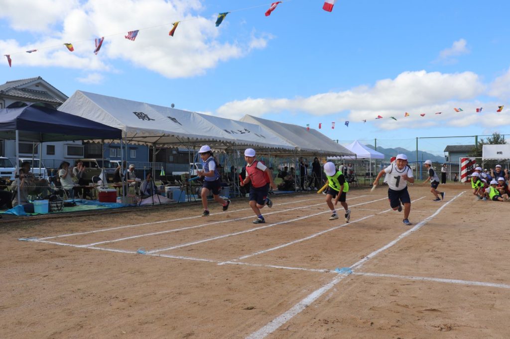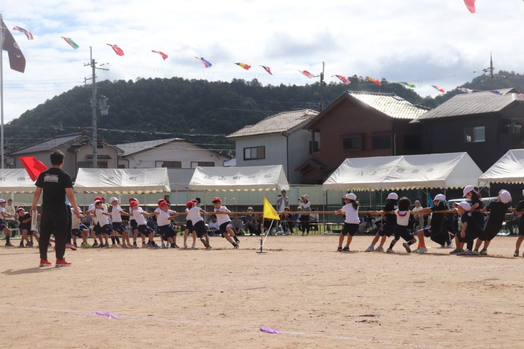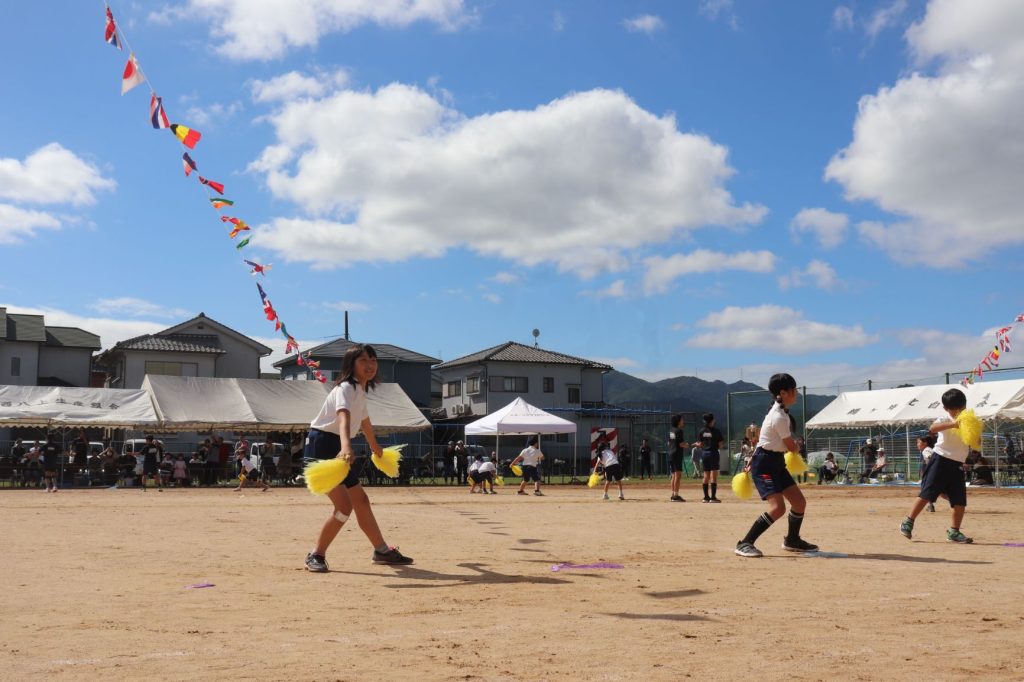 午後の地域の運動会では、参加を希望した子どもたちも一緒に、ご家族や地域の皆さんと一緒に楽しくいろいろな競技に参加していました。子どもたちは、玉入れやリレー、大縄跳びなど、事前に希望していたそれぞれの競技に出場しました。大人の方の競技に、テントの下から大きな声で応援したり一緒に喜んだりしていました。地区のプラカードを持つ役を買って出る子もいました。